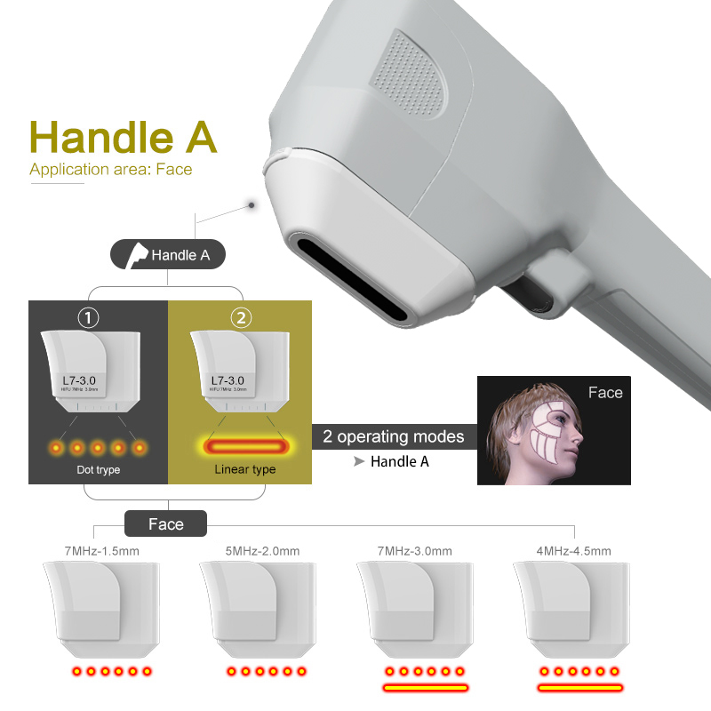 Handle1: for face therapy with 7MHZ/5MHZ/4MHZ, fast shot 1 line
